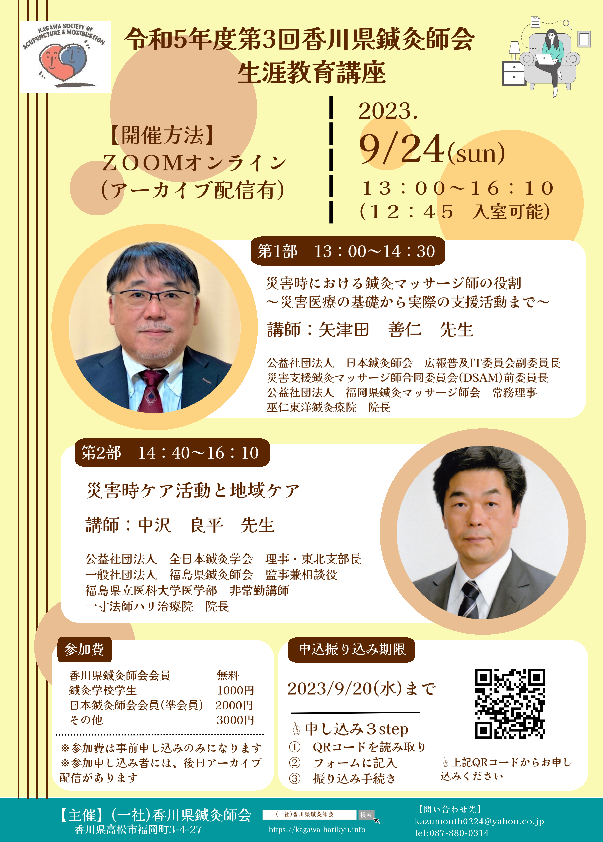 | 9月24日 | 1部 災害時における鍼灸マッサージ師の役割 ~災害医療の基礎から実際の支援活動まで~ 講師 巫仁東洋鍼灸療院 院長 矢津田善仁 先生 2部 災害時ケア活動と地域ケア 講師 一寸法師ハリ治療院 院長 中沢良平 先生 |