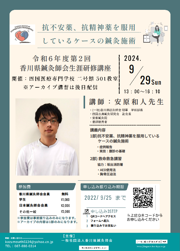 | 9月29日 | 1部 13時~14時30分 「抗不安薬、抗精神薬を服用しているケースの鍼灸施術」 ➀症例報告 ②実技:腹診の基礎 講師 安和鍼灸院 院長 安原和人 先生 (一社)香川県鍼灸師会学術部長 四国古典鍼灸研究会副会長 2部 救命救急講習 14時40分~16時10分 ➀AED使用法 ②胸骨圧迫法 協力 坂出消防署 |